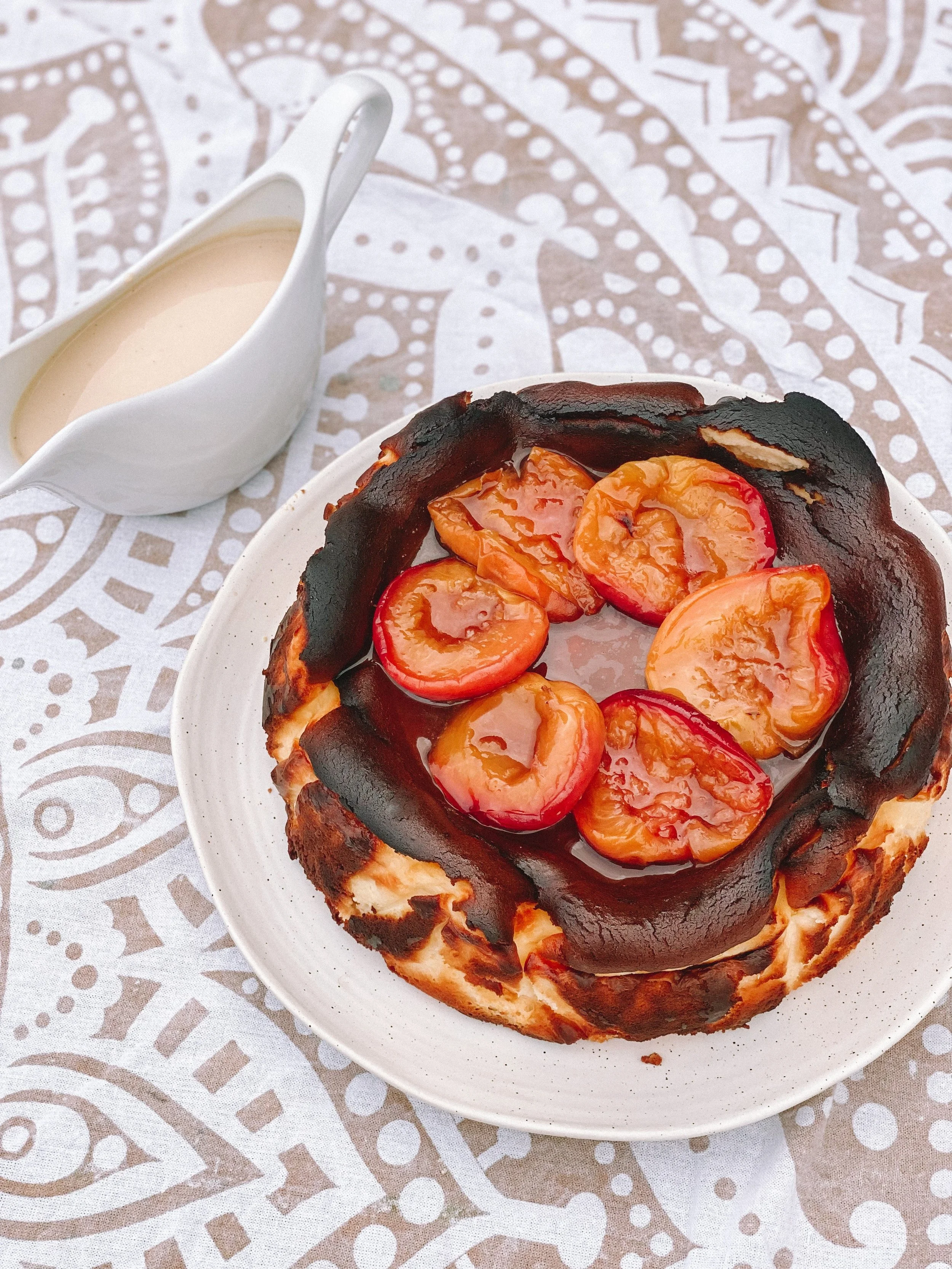 Burnt Basque Cheesecake with Baileys Custard and Roasted Peaches