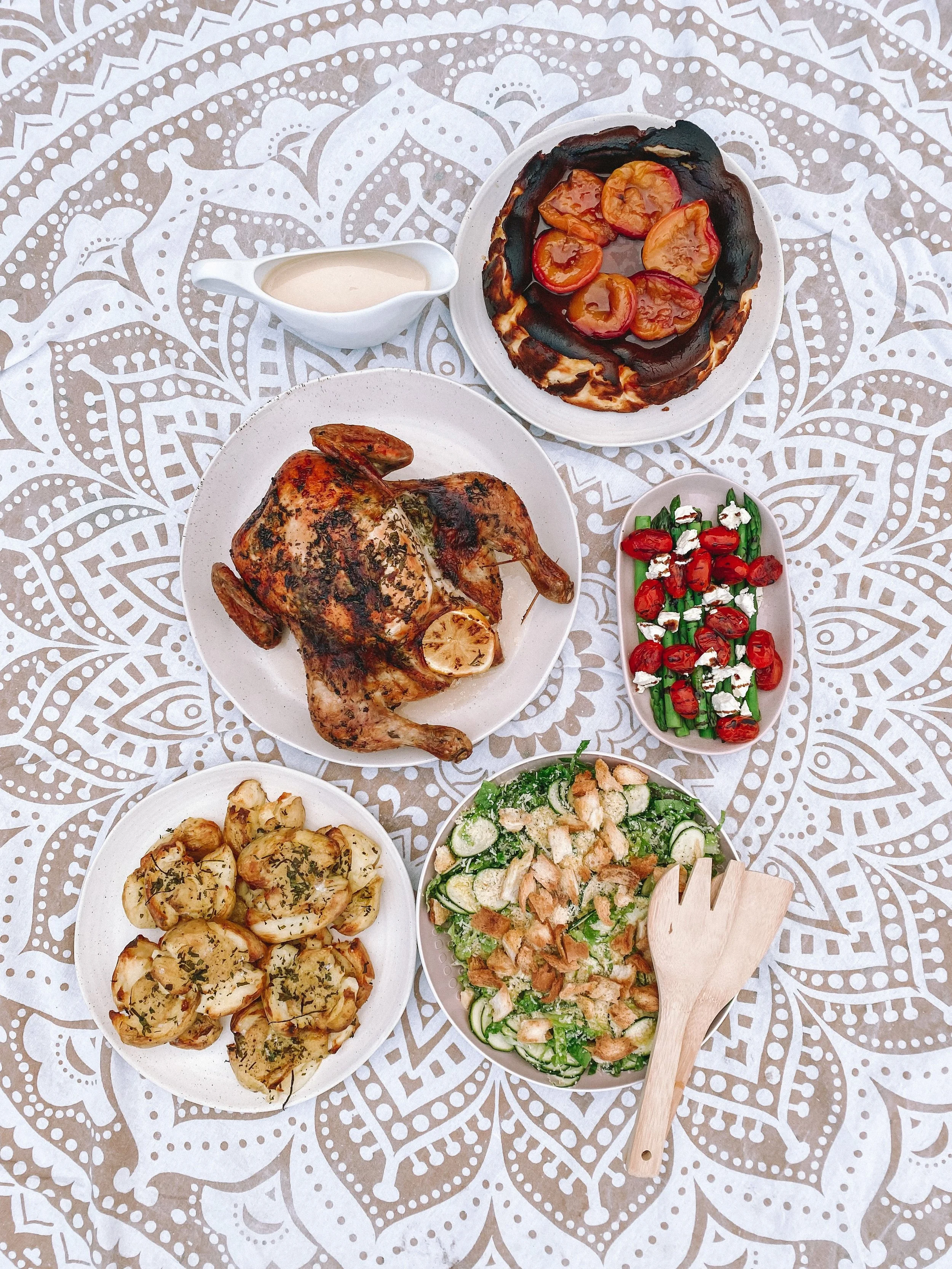 Now time for the main meal. I will be taking you through recipes for a wonderful lemon and rosemary roast chook, crisp, herbed smashed potatoes, a fresh, summer zucchini salad and a spectacular blanched asparagus dish. And hold tight, because dessert is coming too!